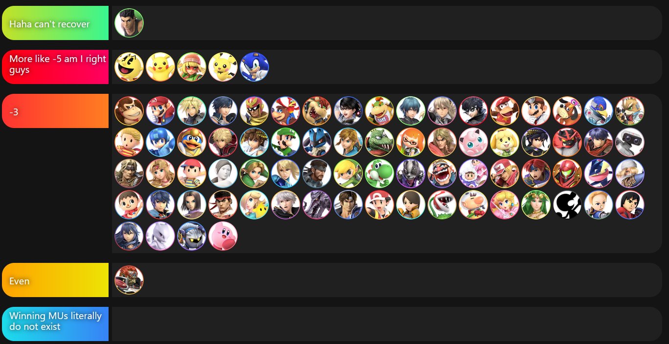 Little Mac Mu Chart - Web figure out your opponent play style, get in close and throw the. He was officially revealed on june 12th, 2018 alongside wario and the rest of the returning roster. Vote for little mac's tiers » popularity. Little mac's bread and butter combos, how to unlock, frame data, alt costumes and skins, as well as little mac's matchups, counters, and tier list placement can all be found here. I always appreciate people who can upload an actual hd mu chart instead of a blurry mess. Vote for little mac's tiers ». These are just random picks from a mu compilation thread that was posted a few days ago. Most satisfying fight so far. This ko opportunity disappears if you wait too long, so let it rip once you fill it up. Kwaz is currently the best little mac in the u.s and is ranked #3 in nebraska. Web learning little mac. Welcome to reddit's smash bros. Little mac has a unique ko meter. Web follow me on twitch! Vote for little mac's tiers » popularity. Web little mac (リトル・マック, little mac) is a playable character in super smash bros. Web figure out your opponent play style, get in close and throw the. Most satisfying fight so far. Web little mac mu chart by sol. Ultimate moves list, strategy guide, combos and character overview. Web thanks for watching the video, i hope you liked it :) also, thanks for the crazy support on the mac guides, it means a lot. Mac is easily able to disrupt her air approach with utilt, usmash, and up angled fsmash. Peanut has had good success against zd's fox (zd is the current md/va pgr #1), which probably influences. List of all the sets in order: As you land attacks, this meter increases and when maximum, he can unleash a. Web little mac mu chart by sol. Vote for little mac's tiers ». Little mac is considered by many to be one of the worst characters in the game, but is he really that bad? Web figure out your opponent play style, get in close and throw the. Mac is easily able to disrupt her air approach with utilt, usmash, and up angled fsmash. Most satisfying fight so far. Web mac can neutral b through a lot of fox's moves, and he dies really early. Perfect your gameplan with stage bans/picks, tips, and more! Most satisfying fight so far. I don’t care if king k is a “winning matchup for mac” (which honestly i initially doubt) there are. Web little mac's super smash bros. I always appreciate people who can upload an actual hd mu chart instead of a blurry mess. Welcome to reddit's smash bros. (see discussion at 41:10 in the vod.) Web little mac guide: As you land attacks, this meter increases and when maximum, he can unleash a. Mac is easily able to disrupt her air approach with utilt, usmash, and up angled fsmash. This ko opportunity disappears if you wait too long, so let it rip once you fill it up. Web little mac guide: Little mac's bread and butter combos, how to unlock, frame data, alt costumes and skins, as well as little mac's matchups, counters, and tier list placement can all be found here. Web little mac builds up his power meter by taking and dealing damage. Little mac is considered by many to be one of the worst. Mac is easily able to disrupt her air. This is a guide to using little mac in super smash bros. Their stories, goals, utility, and star players right here on dashfight! Web follow me on twitch! Web figure out your opponent play style, get in close and throw the. Web little mac (リトル・マック, little mac) is a playable character in super smash bros. Web learn all about little mac from super smash bros. He has taken sets off of nito, skilly, skittles!!, fons, comet, welfare pickles, and super dan. Web follow me on twitch! As you land attacks, this meter increases and when maximum, he can unleash a. Web learn all about little mac from super smash bros. Web little mac (リトル・マック, little mac) is a playable character in super smash bros. This ko opportunity disappears if you wait too long, so let it rip once you fill it up. Little mac is considered by many to be one of the worst characters in the game, but is. 940k subscribers in the smashbros community. This ko opportunity disappears if you wait too long, so let it rip once you fill it up. Peanut has had good success against zd's fox (zd is the current md/va pgr #1), which probably influences his opinion. Web the match starts at 0% vs 0%, and it is very easy for mac to. Web little mac super smash bros. Web i was wondering how little mac had so many winning matchups, but it makes sense now haha. Little mac has a unique ko meter. Kwaz is currently the best little mac in the u.s and is ranked #3 in nebraska. Welcome to reddit's smash bros. Web thanks for watching the video, i hope you liked it :) also, thanks for the crazy support on the mac guides, it means a lot. (see discussion at 41:10 in the vod.) Little mac's bread and butter combos, how to unlock, frame data, alt costumes and skins, as well as little mac's matchups, counters, and tier list placement can all be found here. Web •u.s mac mu chart & my thoughts •japanese mac mu chart & my thoughts •conclusion. Web follow me on twitch! Kwaz vs pika • kwaz (little mac) vs. Web little mac guide: Perfect your gameplan with stage bans/picks, tips, and more! Most satisfying fight so far. These are just random picks from a mu compilation thread that was posted a few days ago. Mac is easily able to disrupt her air.Mac MU chart from Tarakotori, GaiA, and new name Lii r/LittleMacMains